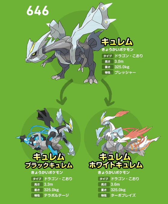 ポケモンGOのキュレム (ホワイトキュレム)の弱点や予想種族値&最大CPのまとめです。 キュレム (ホワイトキュレム)が覚える予想技も掲載しているので参考にどうぞ。 ※原作の情報を元に記事を作成してます。 実際に実装される際にはステータスなどが キュレム No646 タイプ:ドラゴン/こおり 特性(通常) :プレッシャー(受けた技のPPを1多く減らす) 特性(ホワイト):ターボブレイズ(特性に関係なく相手に技を出せる) 特性(ブラック):テラボルテージ(特性に関係なく相手に技を出せる) 体重
